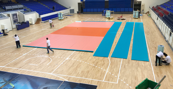 Nous fournissons et installons le terrain adapté à la rencontre sportive : escrime, handball, volleyball, basket, judo, badminton…